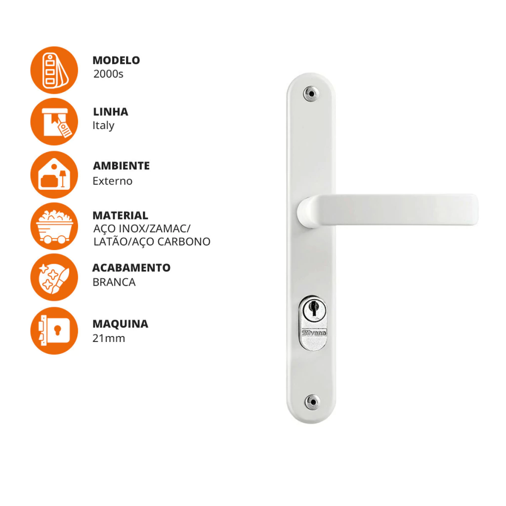 A fechadura externa Silvana 2000s Italy oferece o que há de melhor em qualidade e design para seus ambientes. Com estrutura em aço carbono, zamac, inox e latão, garante resistência e durabilidade. Seu acabamento em branco perola traz um toque de elegância ao ambiente.