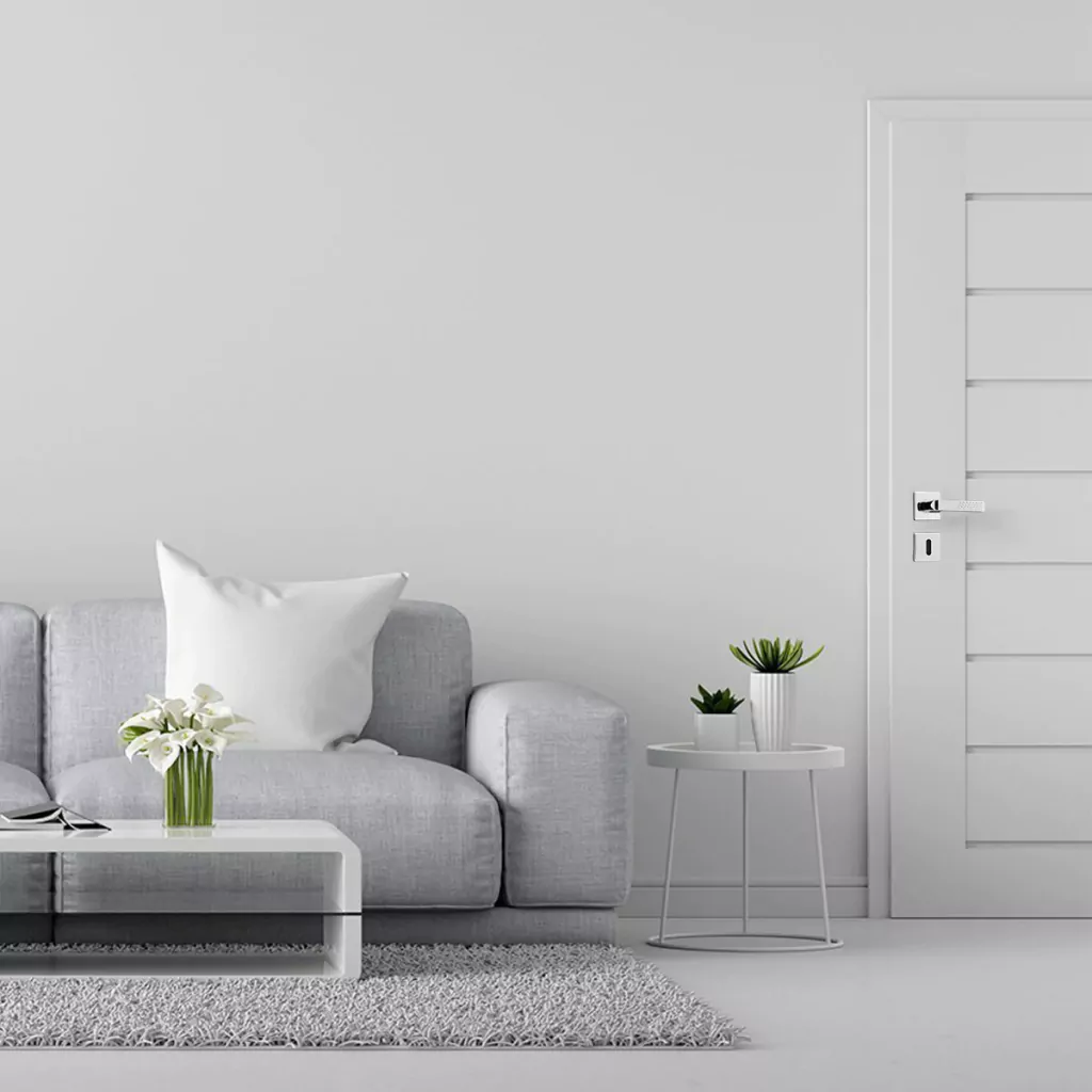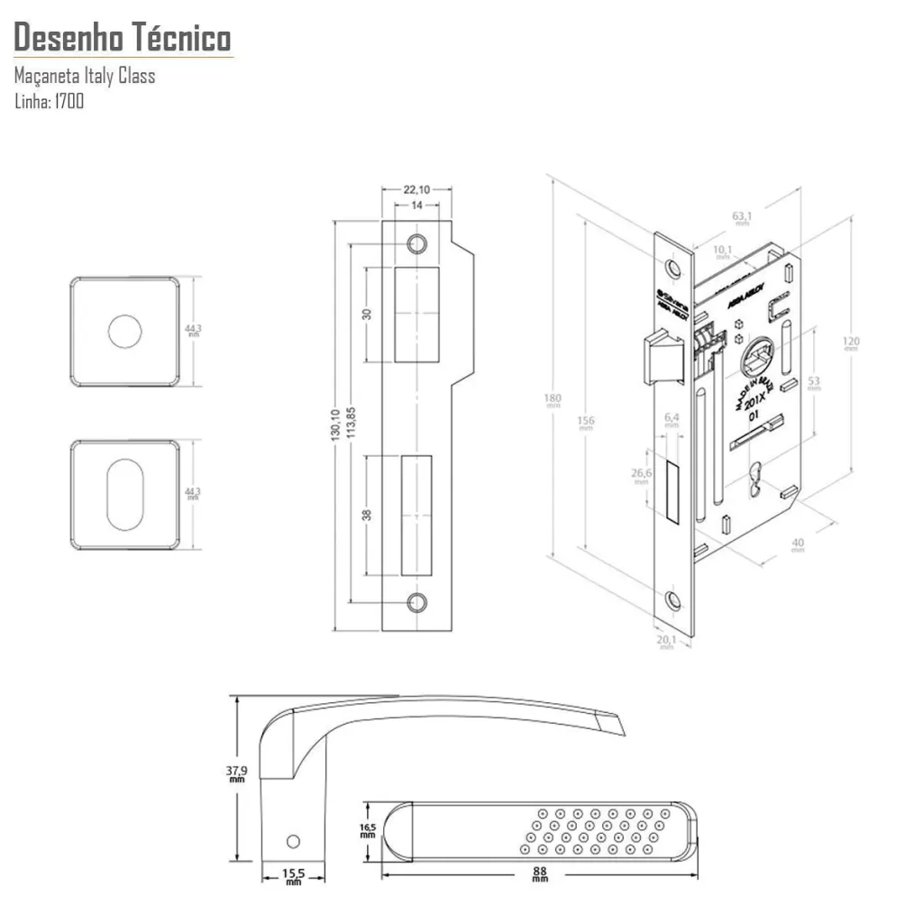 Possui maçanetas, trinco e lingueta em zamac, conferindo robustez ao produto.