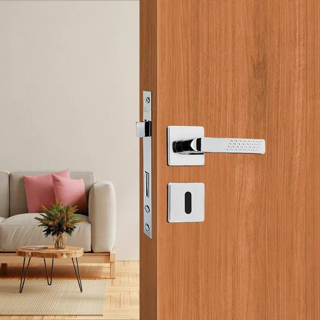Design elegante com acabamento cromado, perfeito para portas de madeira de 25mm a 30mm de espessura.